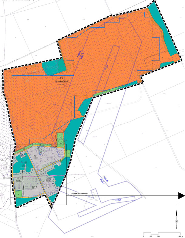 Zielstellung der Planung war es, die planungsrechtlichen Voraussetzungen für die flächenhafte Erzeugung von Energie aus Sonnenkraft zu schaffen. Um das Flugfeld für die Aufstellung der Photovoltaik-Module nachzunutzen, war es erforderlich ein, großflächiges Sondergebiet gemäß § 11 BauNVO festzusetzen. Der südliche Flugplatzbereich, welcher von zahlreichen Gebäuden geprägt ist, wurde entweder als Gewerbegebiet gemäß § 8 BauNVO oder aber als Industriegebiet nach § 9 BauNVO festgesetzt, um Potenzialflächen für die Ansiedlung von Gewerbe- und Industriebetrieben vorzuhalten. Neben der wirtschaftlichen Verwertung der Konversionsfläche galt es auch, Belange des Naturschutzes und insbesondere des besonderen Artenschutzes zu berücksichtigen und diese miteinander in Einklang zu bringen.